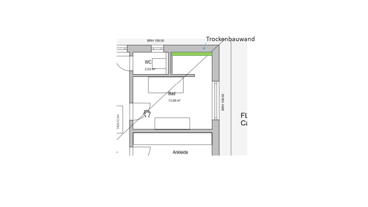 Planlinks in der Dusche ist auch eine Trockenbauwand, wo aktuell der HTHK hängt.