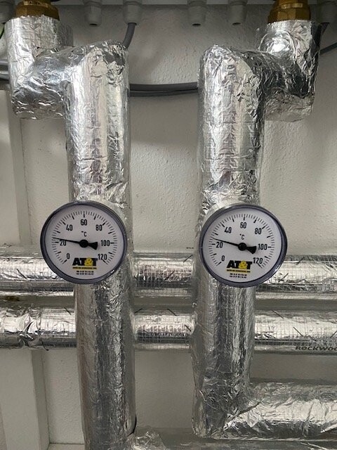 Wenn ich die Anzeige der roten Röhrchen an den Heizkreisverteilern addiere, komme ich auf 30L/min