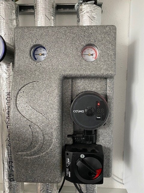 30l/min in den Durchflussröhrchen sind 1800l/h. Das entspricht doch ziemlich genau dem, was der Heizungsbauer an der Mischerpumpe eingestellt hat. Super, alles Wasser geht in die Fußbodenheizung. So muß es sein. Jetzt brauchst Du nur Geduld. Bin auf das Taktverhalten gespannt.