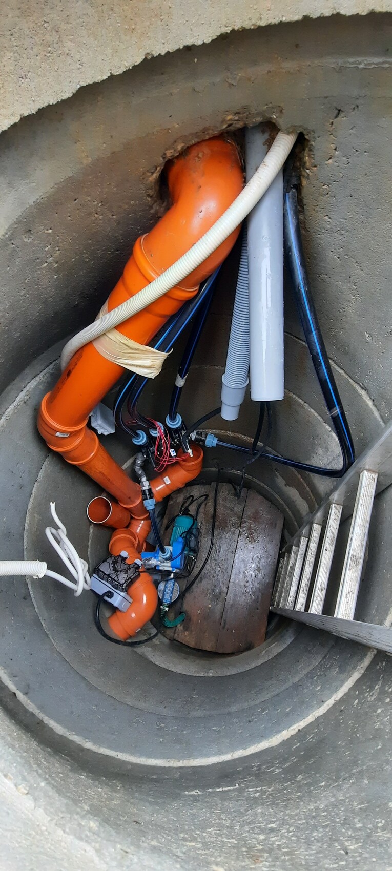 Anschließend Podest auf halber Höhe gebaut, auf welchem die Pumpe steht. Die ganze Ventiltechnik kam ebenfalls rein. Habe in dem Zuge auch ein 110 KG Rohr für die zukünftige Terrassenüberdachung gelegt zum Entwässern.