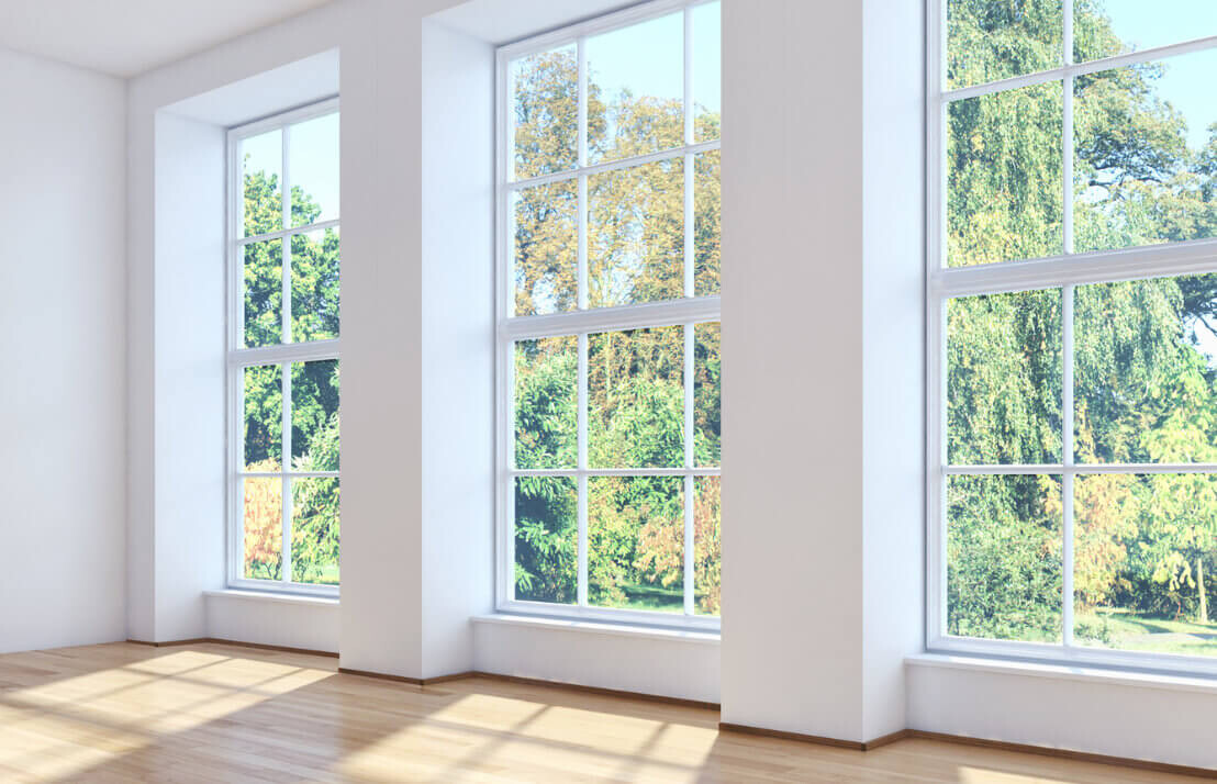 Heller, leerer Raum mit großen Fenstern, Holzboden und Blick auf grüne Bäume.