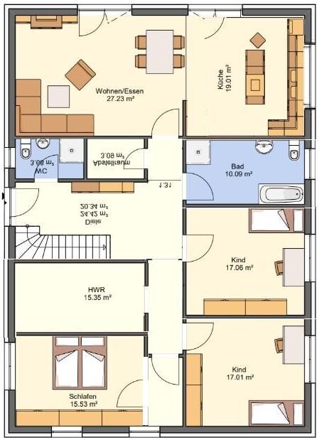 Zur grundsätzlichen Zonierung sind Kinderzimmer mit gleichen Interessen gut zusammen aufgehoben, das Familienbad zwischen bzw bei den Schlafräumen. Bei Extra-WC könnte man daraus ein separates kleines Bad für Eltern oder Kinder mitmachen, Hauswirtschaftsraum bzw Abstellraum muss funktionieren. Am besten noch, Schlafräume mit Tür abgrenzen.