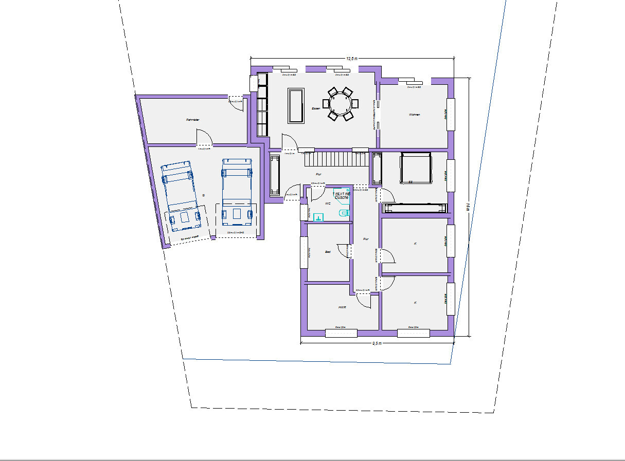 In deinem Grundriss finde ich das Wohnzimmer sehr klein. Der Rest gefällt mir sehr gut. Insbesondere die Lösung mit der Garage ist top.Ich würde einfach mal das Haus mit einer genormten Garage schräg setzen, das heisst, an die nördliche Grundstücksgrenze parallel. das hat dann den Vorteil, dass Du noch mehr Westsonne in den unteren Hausteil bekommst und sich ein interessanteres Terrassenbild im Süden ergibt.