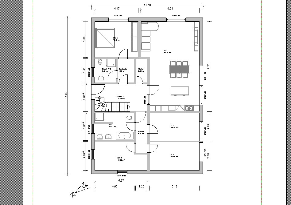 Ich hatte bei dem Grundriss noch mal bissl rumprobiert. Ich würde es jetzt so machen, wobei die Treppe normal 1/4 gewendelt ist und kein Podest hat (Programmfehler).