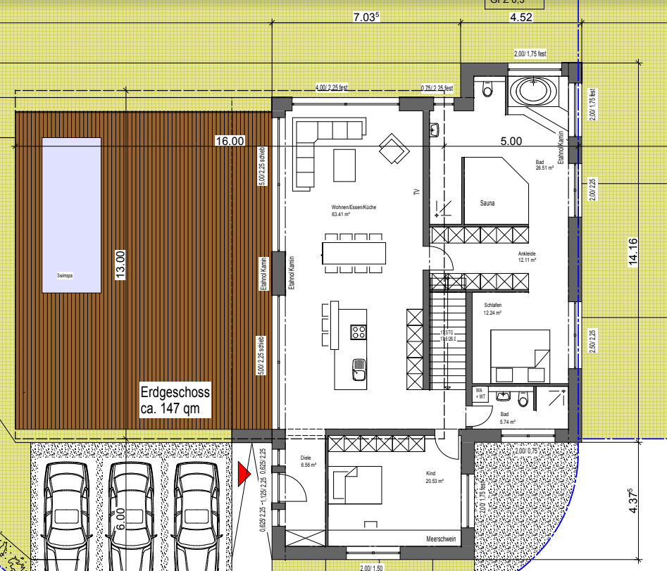 2. Bei so einem offenen Grundriss könnte es für das Kind sehr laut werden. Vor allem wenn alle Gäste an der Zimmertür vorbei zum Klo müssen. Oder wenn sich das Kind abends fertig macht und dabei nicht seine Ruhe hat. Sowas hätte ich als Kind furchtbar gefunden!
