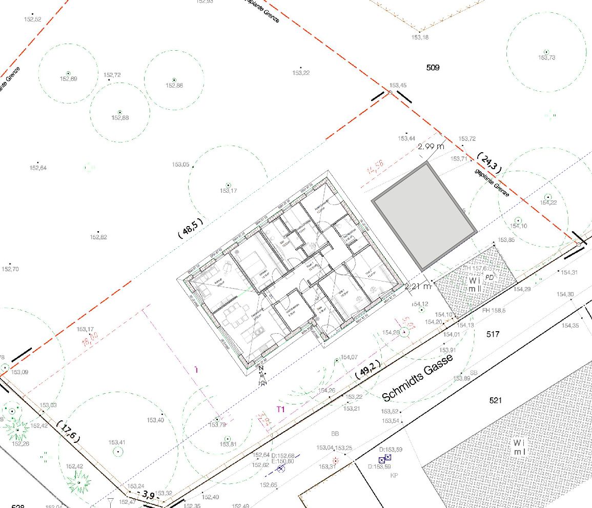 Mir ist gerade aufgefallen, dass mein Programm mal wieder auf 42,5 cm Außenwände eingestellt war und ihr nur mit 36,5 cm geplant habt. Außenmaße meiner Lösung wären also entsprechend 12 cm in jeder Richtung geringer.