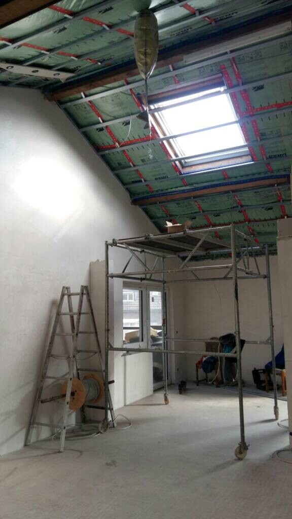 Innenraumbaustelle mit Gerüst, Leiter, Kabelrollen und offenem Dachfenster.