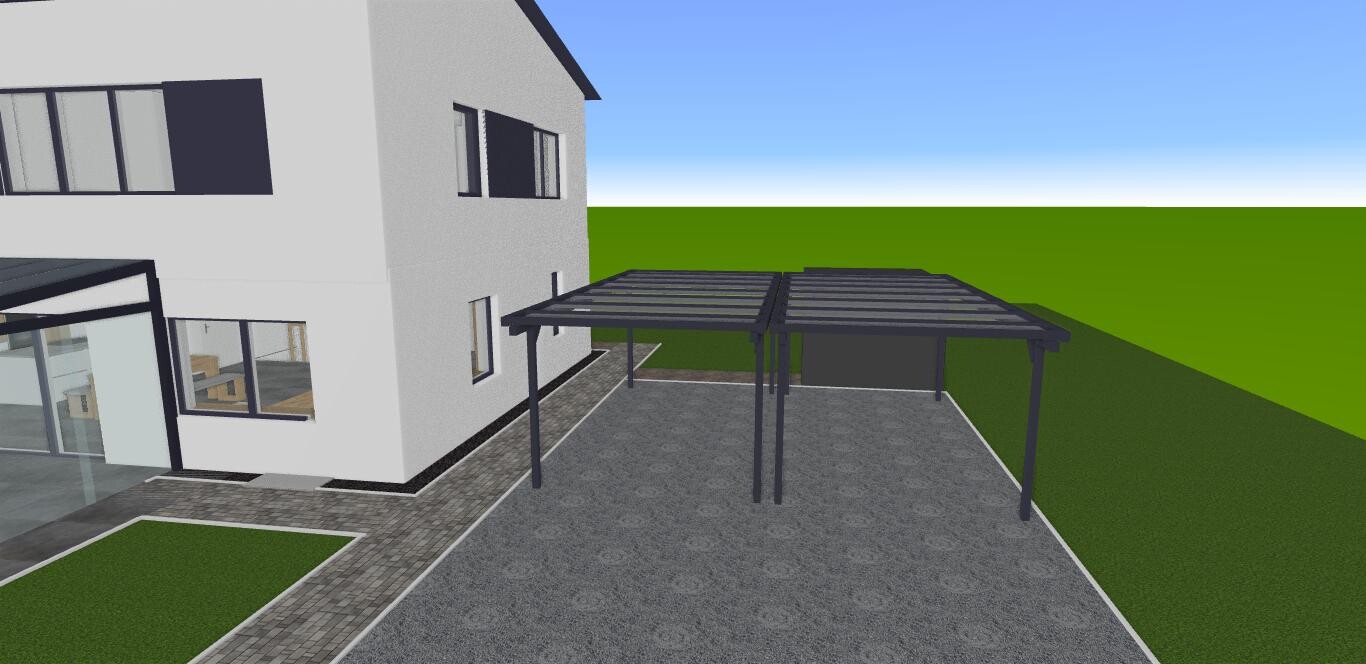 und einmal mit zwei Einzelcarports und einer günstigen Wellblechhütte als Fahrrad/Geräteraum.