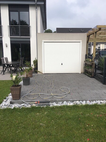 So stellt sich die Situation dar. Ich würde die Wandstärke der Garage auf um die 10cm schätzen auch wenn es auf dem Bild deutlich dünner wirkt.