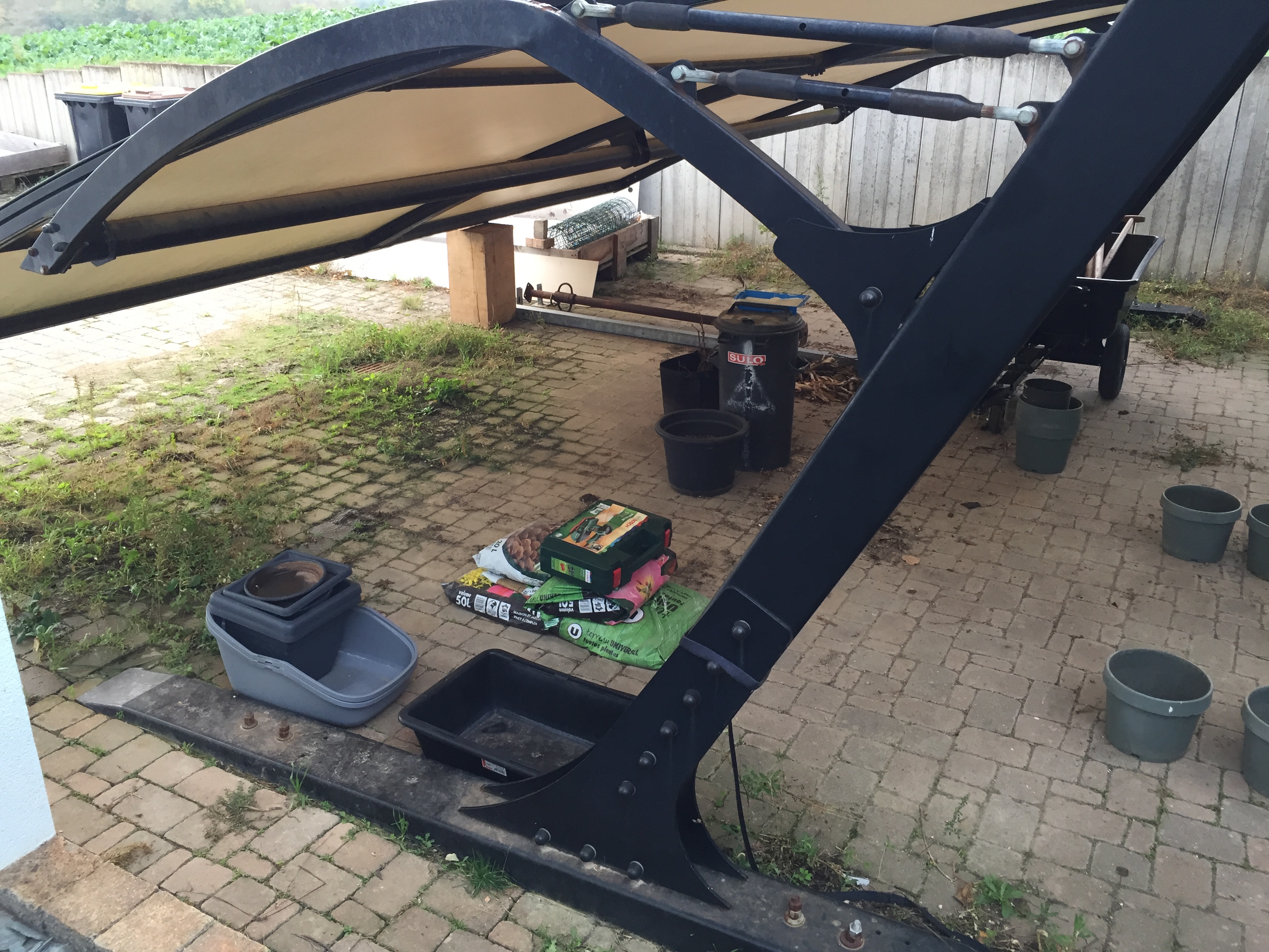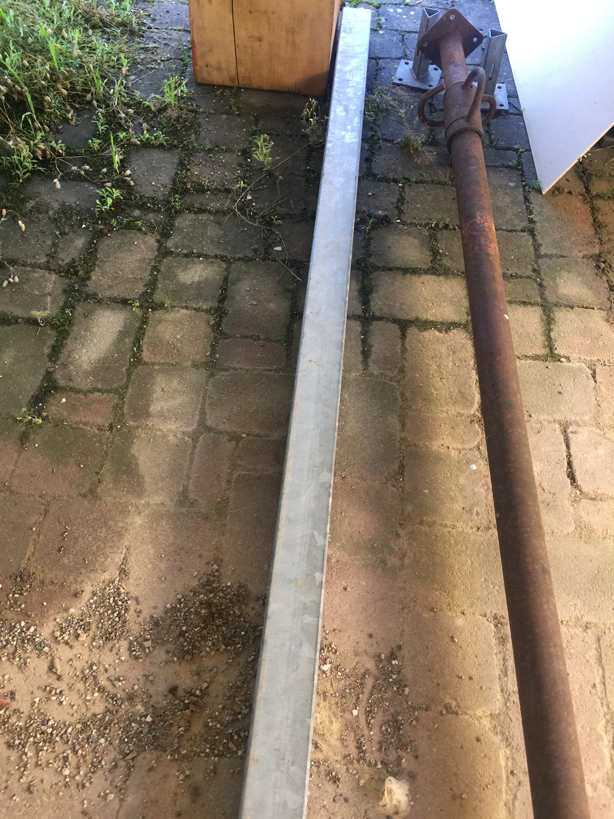 Ein Dorfbewohner hat uns angeboten, den Carport zu reparieren, indem das Dach aufgerichtet werden und durch zwei zusätzliche Stahlpfosten gestützt werden soll. Diese können jedoch nicht vorne in den Ecken angebracht werden, da sonst die Einfahrt zur Garage blockiert würde. Sie müssten etwas weiter hinter montiert werden, sodass das Dach immer noch frei überhängen würde. Die kaputten Stahlträger des Daches sollen durch aufgeschraubte Platten stabilisiert werden.