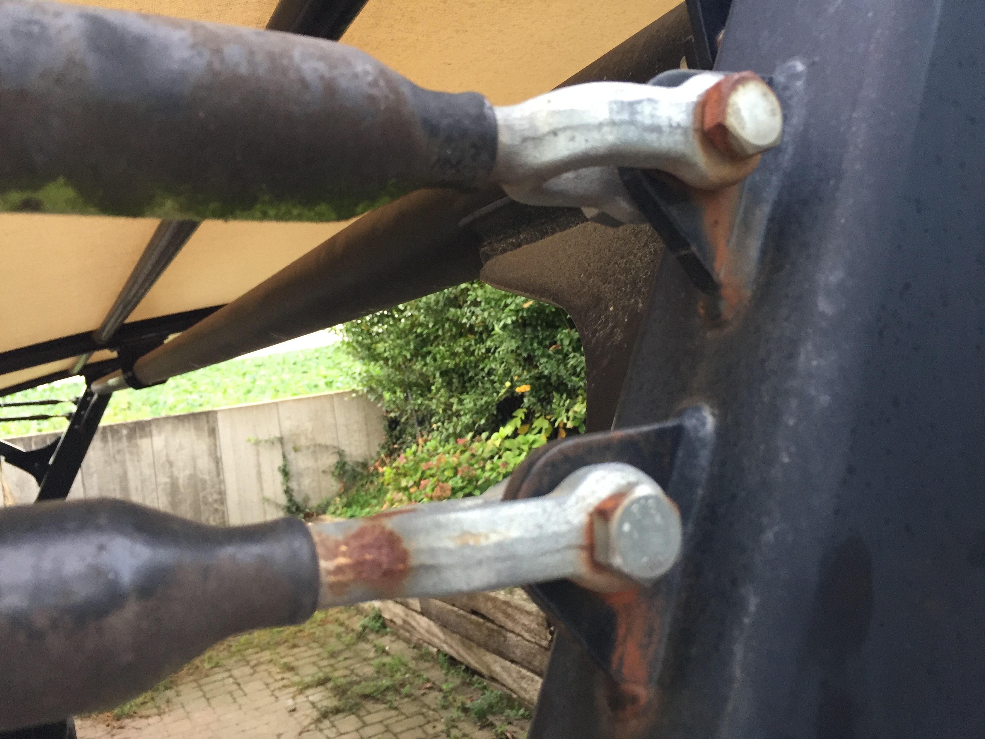 Ebenso die rostige Schweißnaht senkrecht an der Stütze kann mit der Flex abgeschliffen, dann vor Ort nachgeschweißt und mit Farbe und Pinsel wieder lackiert werden. Wird halt nur nicht so schön aussehen. Könnte man dann machen, wenn gerade die alten defekten Rohrprofile ausgebaut sind, dann hängt an dieser Naht keinerlei Last.