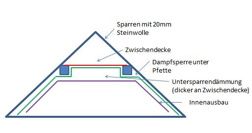 Da die Dampfsperrfolie nicht hinter den Pfetten verlegt werden kann, sondern die Pfetten umschliessen muss, kann die Folie auch nur unter der Zwischendecke laufen anstatt bis zum First hoch? Müsste dampftechnisch ja kein Problem darstellen. Dann würde ich unter der Folie die Querlattung machen, nachmal ne Dämmschicht auftragen (an der Zwischendecke nochmal dicker) , Leitungen Verlegen lassen und dann mit Rigips o.ä. verkleiden.