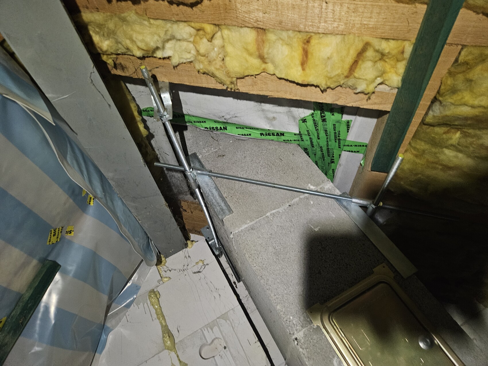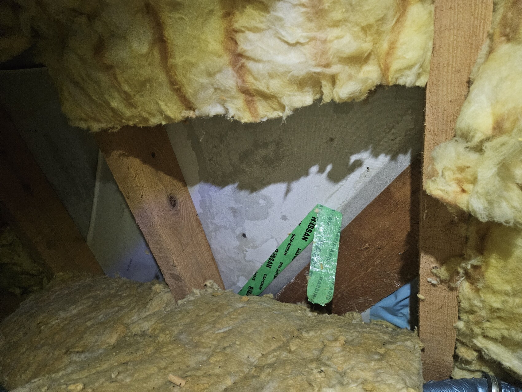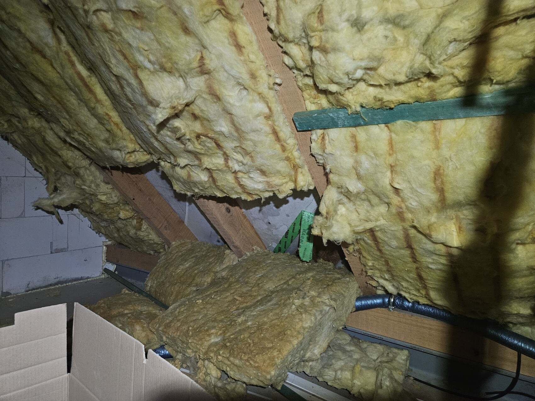 Sieht ehrlich gesagt ein bisschen so aus als hätte es dort Probleme mit Feuchtigkeit gegeben ? Sieht nach Wasserflecken aus. Eventuell wurde deswegen dort die Dämmung entfernt?