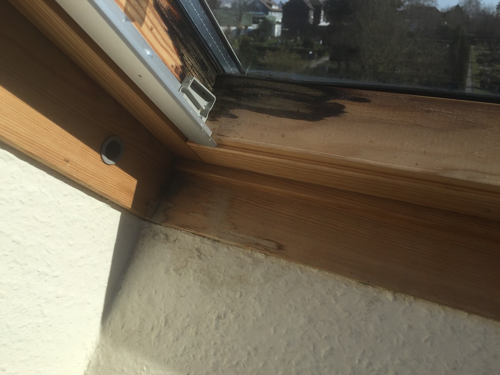 Das sieht mir eher nach einem Feuchteschaden aus. Wenn das Fenster nicht undicht ist, kann es sich um Kondensat aus der Raumluftfeuchte handeln, das an dem kalten Fenster ausgefallen ist. Das Fenster hat dann einen sehr niedrigen Wärmedämmwert. Interessant wäre, das Herstellungsjahr des Fensters zu wissen und den Wärmedurchgangswert (Uw-Wert). Bei Velux ist das Typenschild oben rechts/links im Rahmen, über der Griffleiste zu finden. Optisch könnte das Fenster aus den 90er Jahren stammen. Wenn es Kondensat ist und keine Fensterundichtigkeit vorliegt, spricht das für eine ungewöhnlich hohe Raumluftfeuchte in Kombination mit geringer Heizleistung und mangelhafter Lüftung. Eventuell ist auch das Dach unzureichend gedämmt. Könnte in dem Zusammenhang auch überprüft werden.
