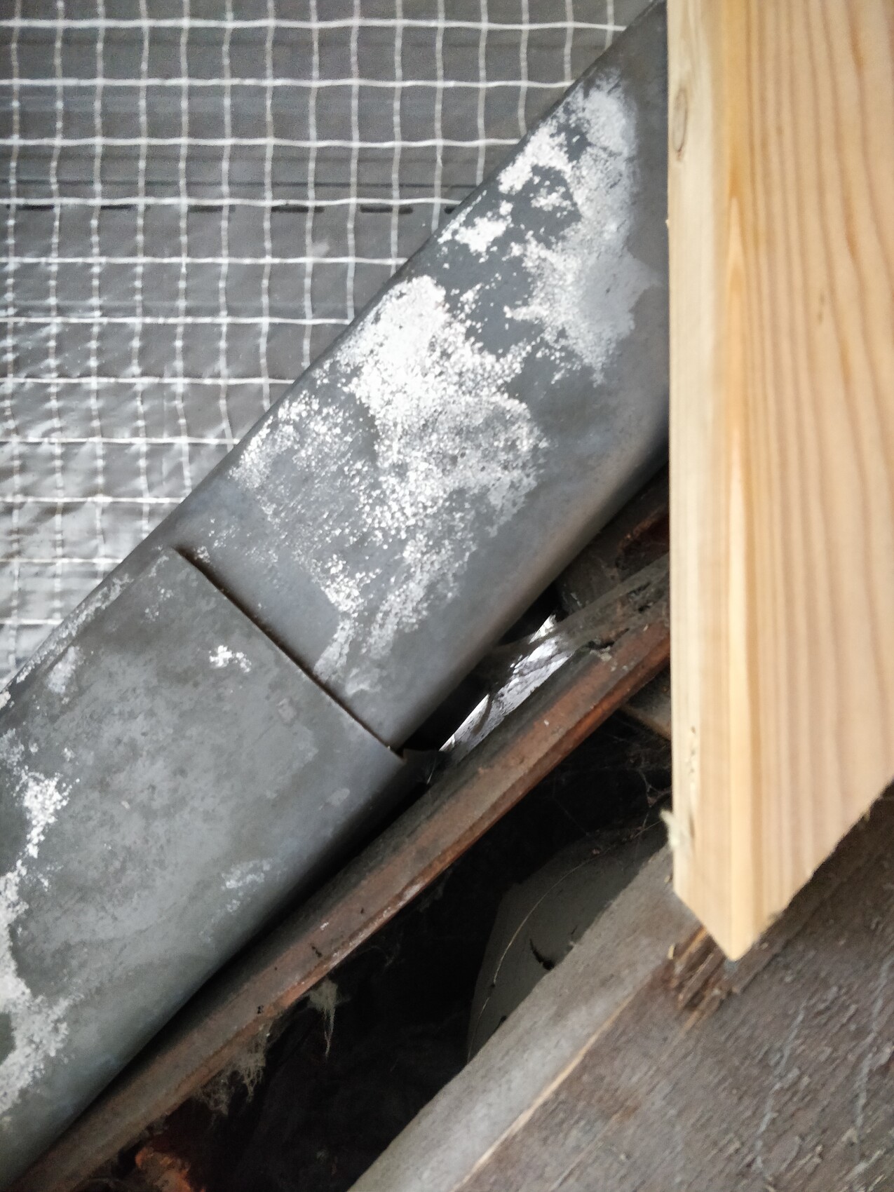 Was mich jedoch stark wundert, ist, dass die Gaube unten völlig geöffnet ist. Wenn ich die Dämmwolle entferne, schaue ich auf die Dachziegel mit der schlechten Dämmung aus den 60er Jahren. Ich kann sogar unter das Walzblei nach draußen schauen. (Das Dach bleibt aber erst mal so, wie es ist.)