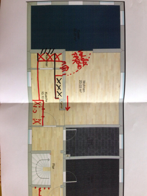 Kammer ggü der Wohnzimmertür, dann ergibt sich ein kleiner Vorflur, der hoffentlich die Bewohner ablenkt, immer durch die schmale Küche zu gehen, wenn der Zugang zum Essbereich nach hinten versetzt wird. Also Abstell weg und in rot zu sehen ein weiterer Zugang zum WZ in der Nähe zum Ess. Oder in schwarz Zugang zum Ess von Küche aus, hat den Vorteil, dass noch Licht durch diese Tür in die Küche fällt und im WZ keiner stört.