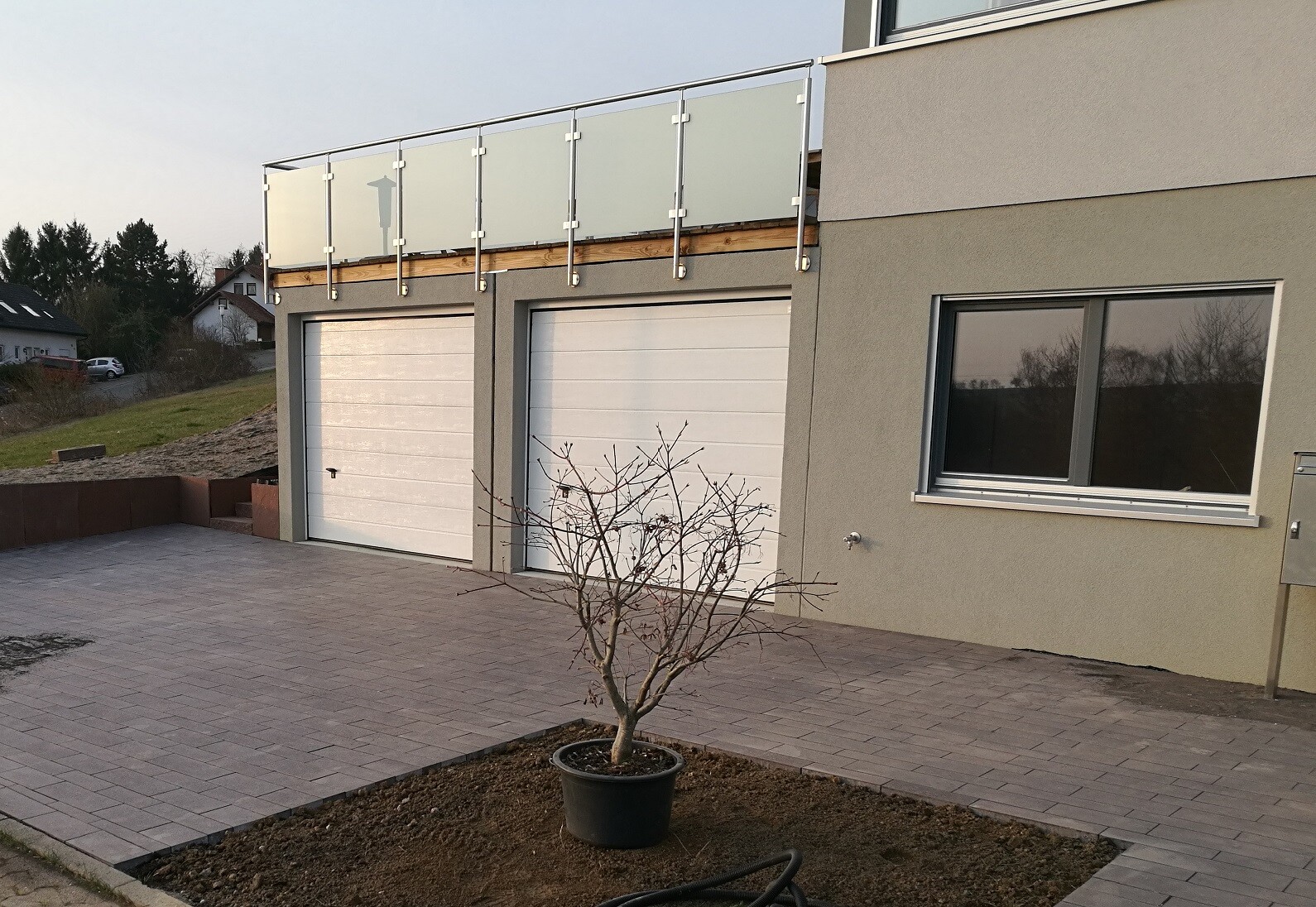 Das Geländer ist Edelstahl mit Glas und an der Garage befestigt. Das ist nicht so einfach, weil die Wände der Garage dünn sind. Ich habe damals eine Software von Fischer verwendet um das zu planen. Die Form der Auflageplatte vom Geländer hat da einen Einfluss, und natürlich die Länge des Hebels von den Geländerstangen. Am Ende habe ich die damals am besten tragenden Anker von Fischer eingeklebt. Das war recht teuer und aufwändig, aber ich wollte keinen Kompromiss bei der Sicherheit. Plan B wäre gewesen, durch zu bohren und eine Platte auch an der Innenseite zu verwenden. Das ging aber nicht weil das Dach weiter schon geschrieben schräg verläuft.