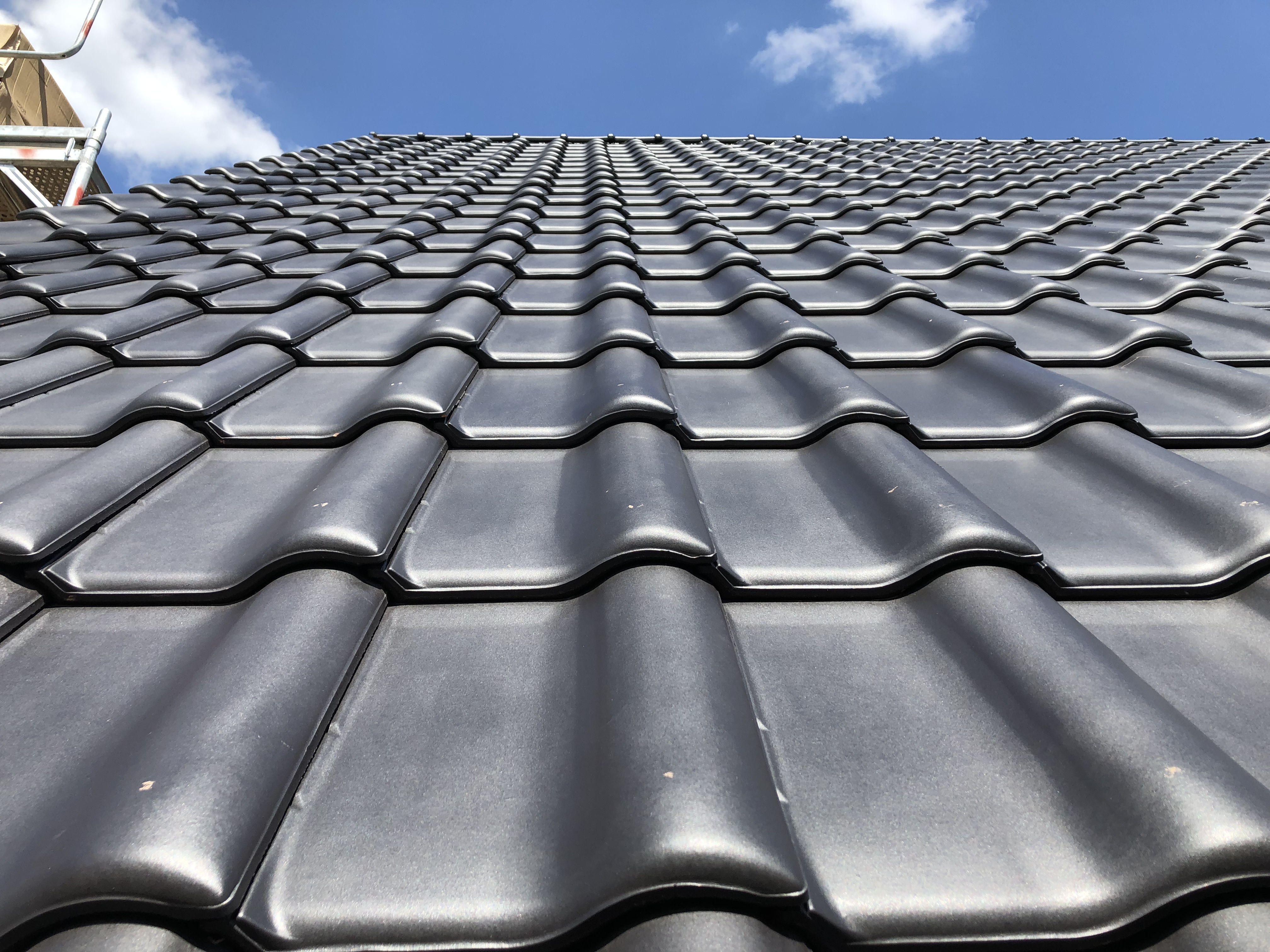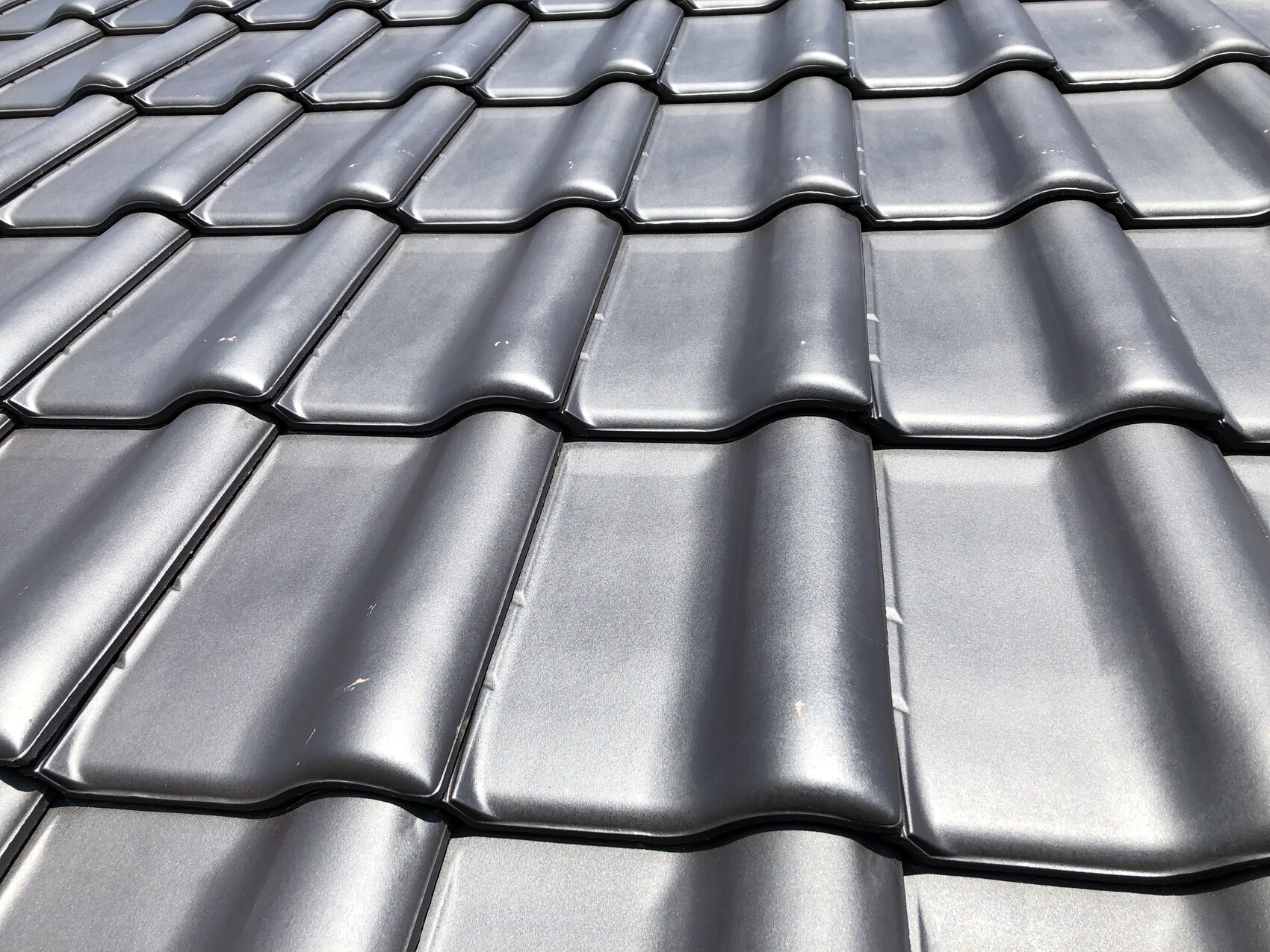 Nahaufnahme grauer, gewellter Metall-Dachziegel auf einem Ziegeldach