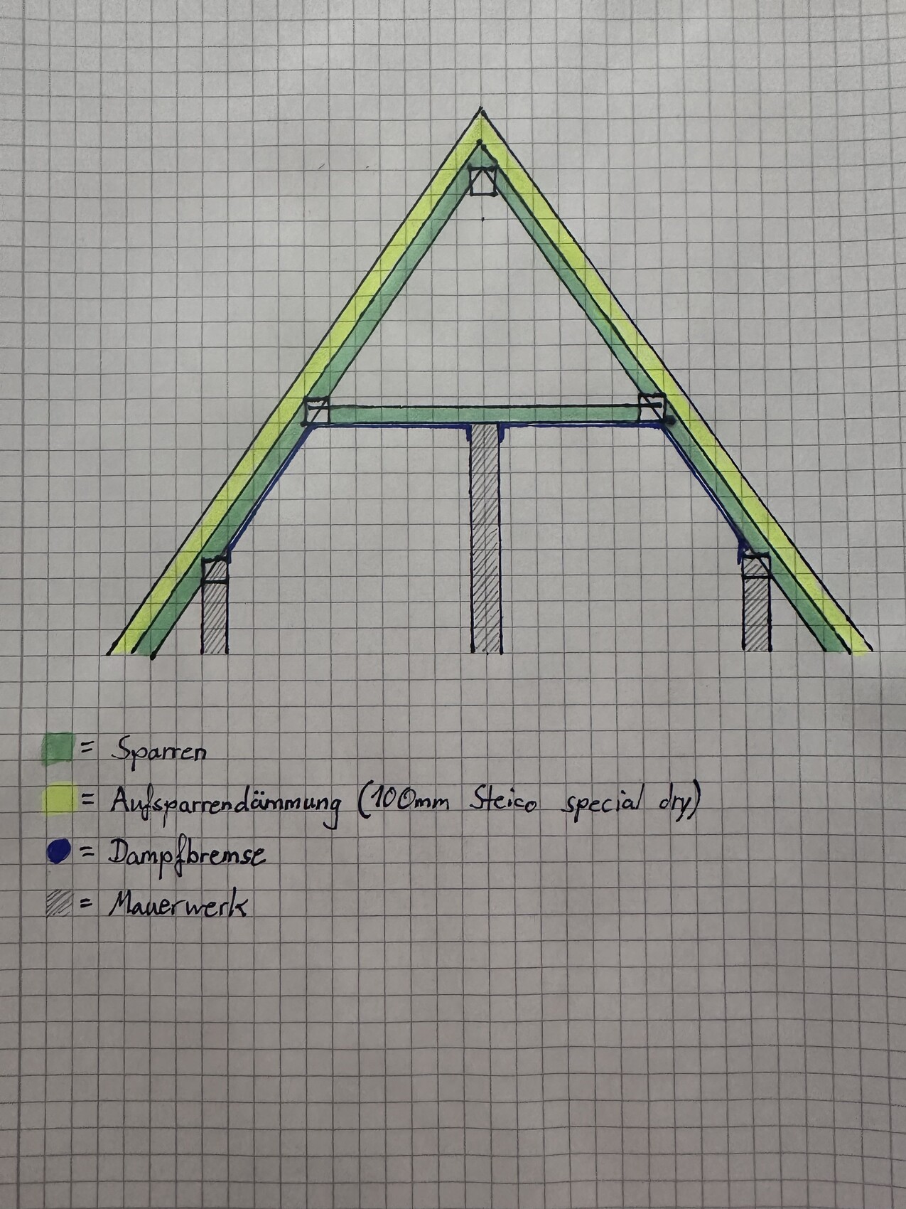 Satteldach mit Sparren, Aufsparrendämmung, Dampfbremse, Stützen und Mauerwerk.