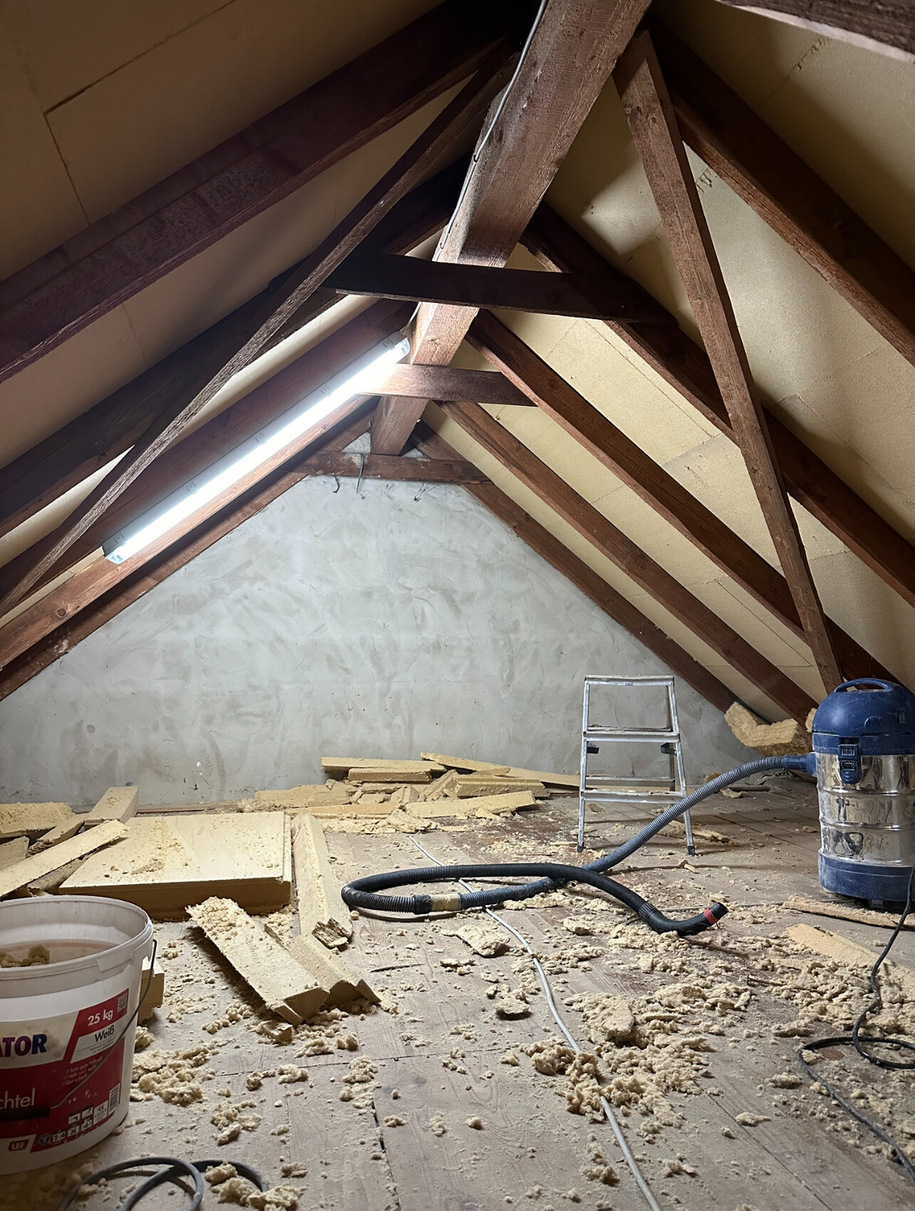 Dachboden mit Holzträgern, Staub, Dämmstoffreste, Staubsauger, Leiter, Eimer.