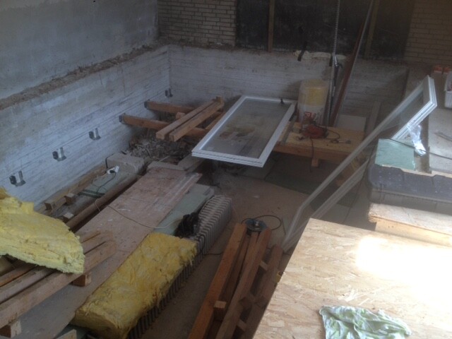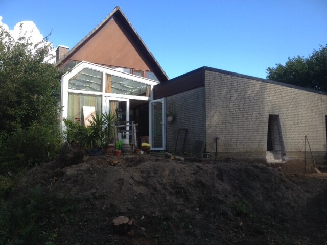 Das Haus steht auf einem Hang, hinten kommt ein Fenster mit 3,00m Breite, der Hang wurde 0,80m abgetragen, damit es eine Ebene mit dem Innenraum wird.