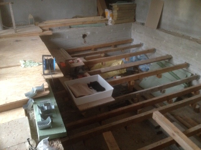 Zwischen den Balken, (2 Balkenmit 14 und 6 cm Höhe Auflattung) 20cm Dämmung Klemmfilz, Querlatten von unten, damit sie nicht durchfallen, Folie, OSB Platten 25 mm drauf und Laminat drauf. Fertig.
