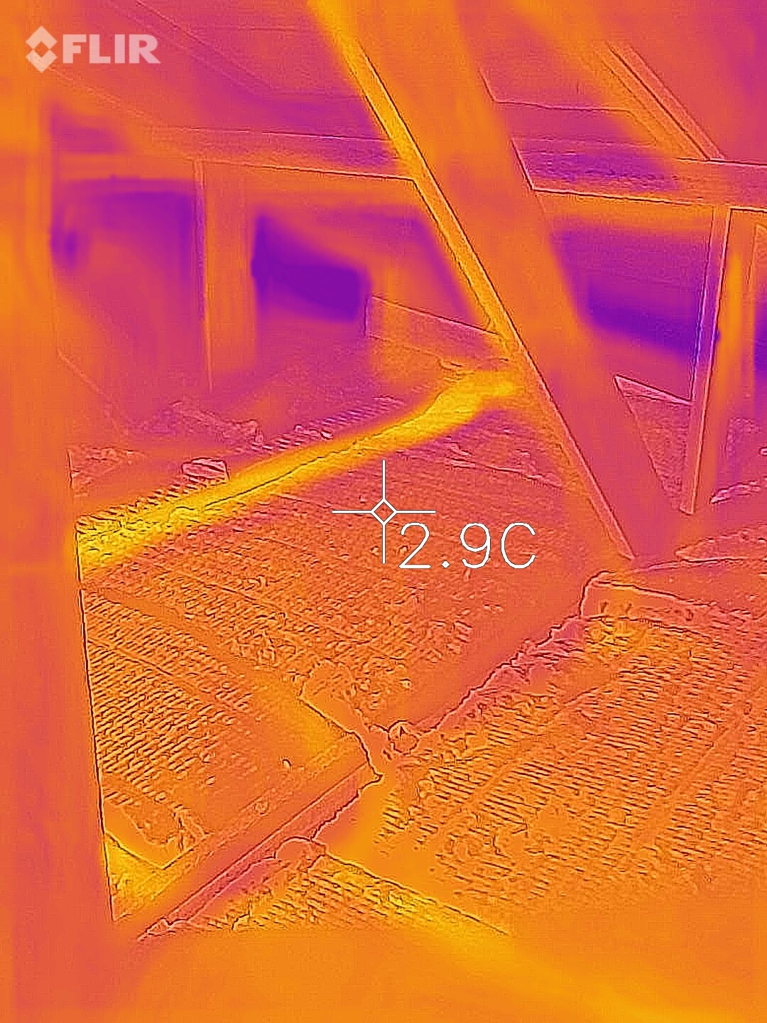 Anbei auch ein Wärmekamera Bild. Der gelbe Streifen oberhalb der 2,9 °C ist übrigens die Innenwand, die dann hoch bis zum Spitzdach geht. Daher auch meine Vermutung.