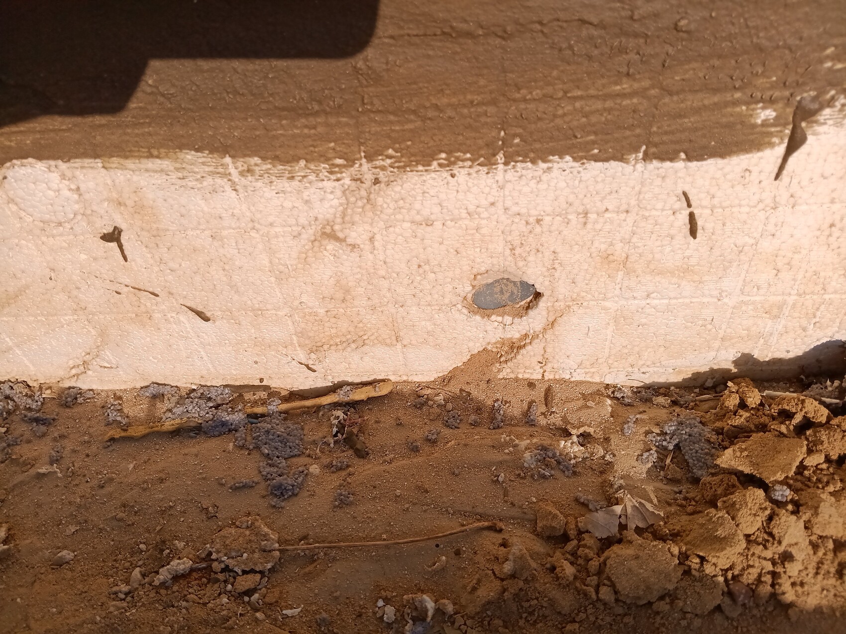 Unterer Wandabschnitt mit weißer Schaumstoff-Isolierung, erdiger Boden und Loch in der Isolierung.