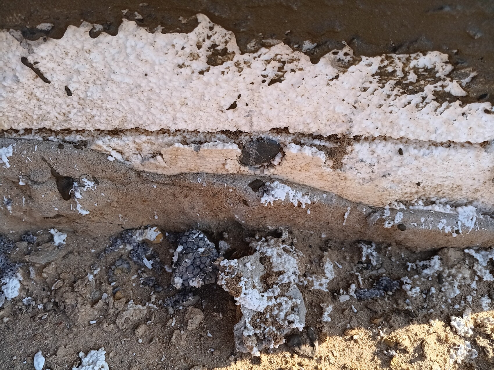 Nahaufnahme einer bröckelnden Wand: weiße Dämmung/Schaum, beige Putzschicht, darunter Erde und Kies.