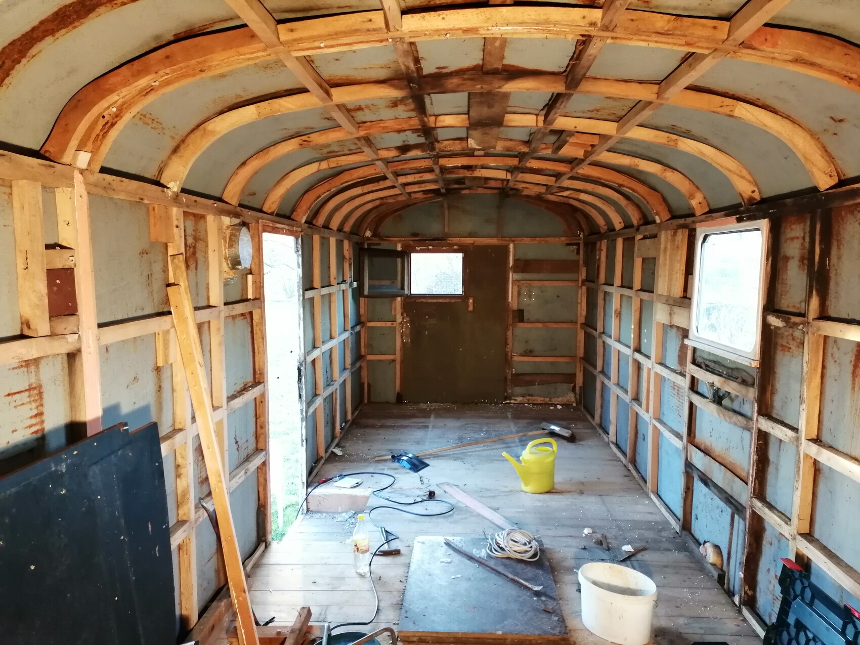 Leider ist in der Vergangenheit mal Wasser in den Wagen eingedrungen daher sind einige der Latten (alles Eiche, mh ) ziemlich verfault und werden ausgetauscht.