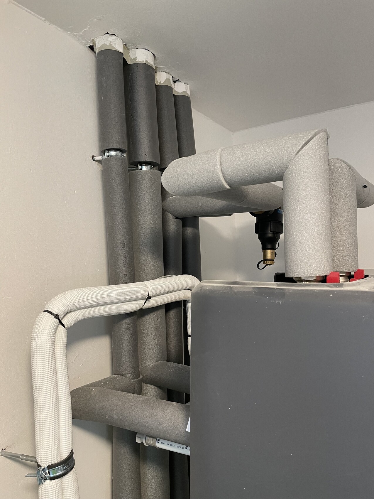 Mehrere grau isolierte Rohre neben einem Heizkessel, weiße isolierte Kabelschläuche im Vordergrund.