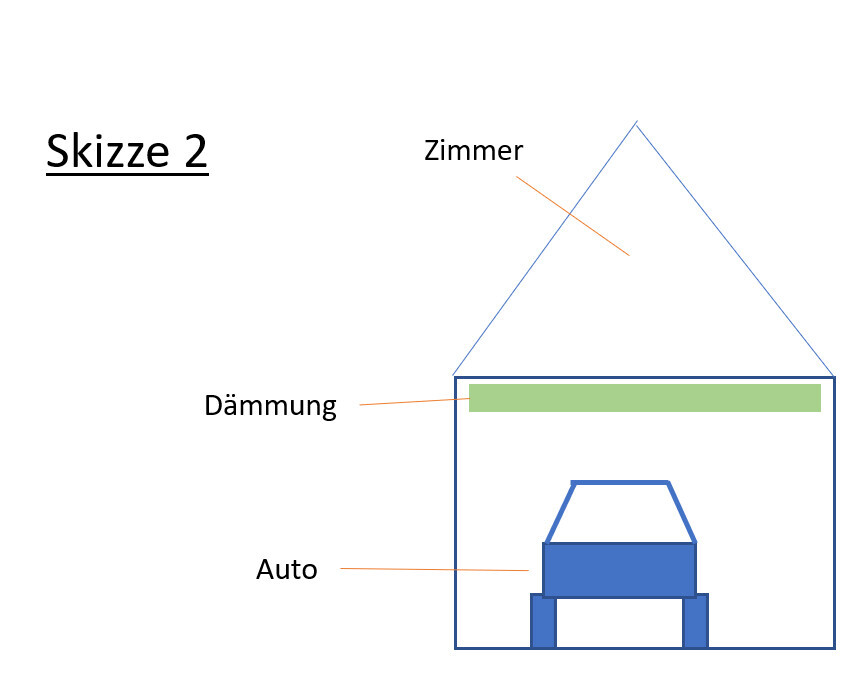 Dann gibt es noch eine zweite Situation (Skizze 2): Über der Garage befindet sich ein Arbeitszimmer. Die Garage ist recht hoch, also hatte ich auch hier überlegt, die Garagendecke zu dämmen, damit man im Zimmer obendrüber nicht so schnell kalte Füße bekommt. Da hätte ich vermutet, dass eine Schimmelbildung an der neuen Dämmung unwahrscheinlich ist, da keine warme Luft zuströmt. Zudem ist die Garage ja des öfteren mal offen, sodass eine gute Belüftung stattfindet. Oder denkt ihr, dass es hier doch zur Schimmelbildung kommen könnte? Die Garage hat übrigens keine Fenster. Wände, Boden und Decke bestehen aus Beton.