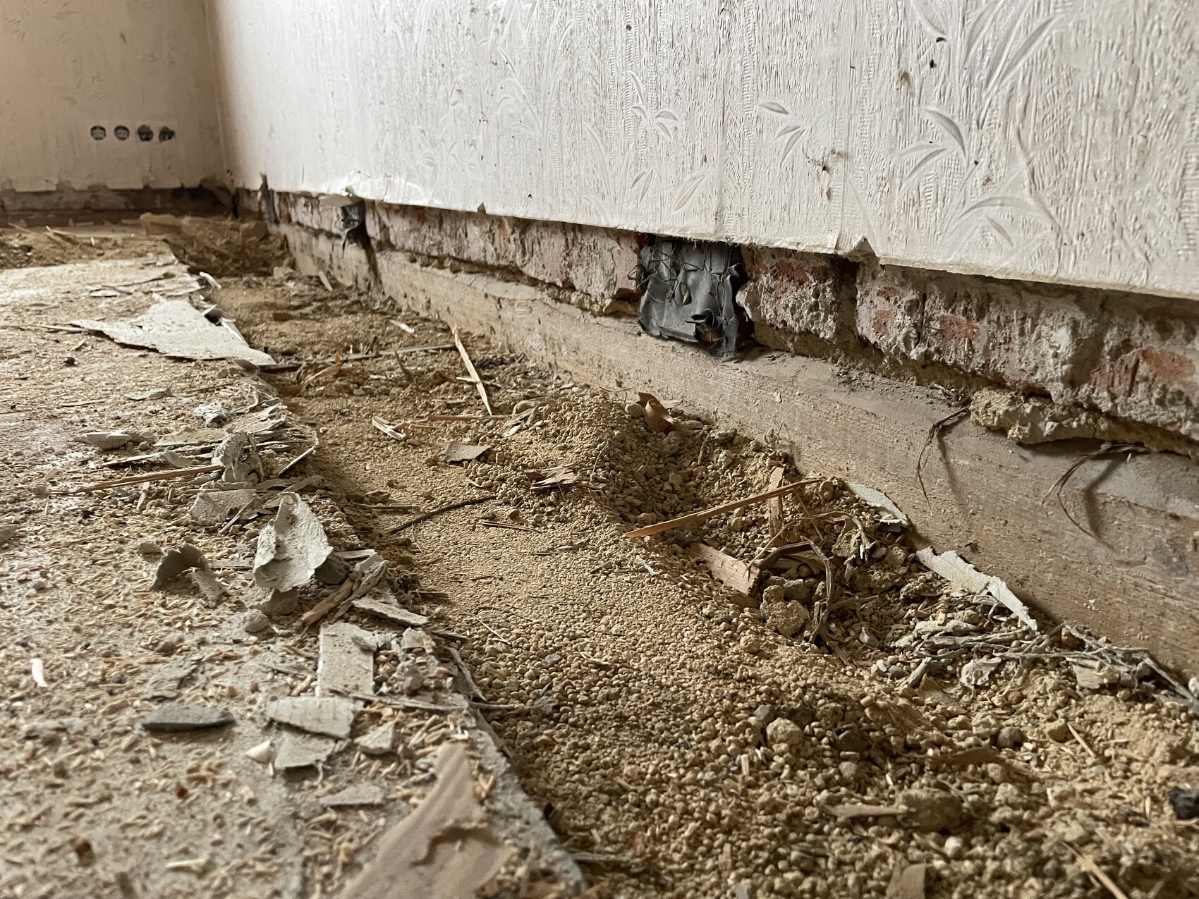 Kellerraum mit beschädigter Wandverkleidung, freiliegten Ziegeln und Boden aus Erde und Trümmern.
