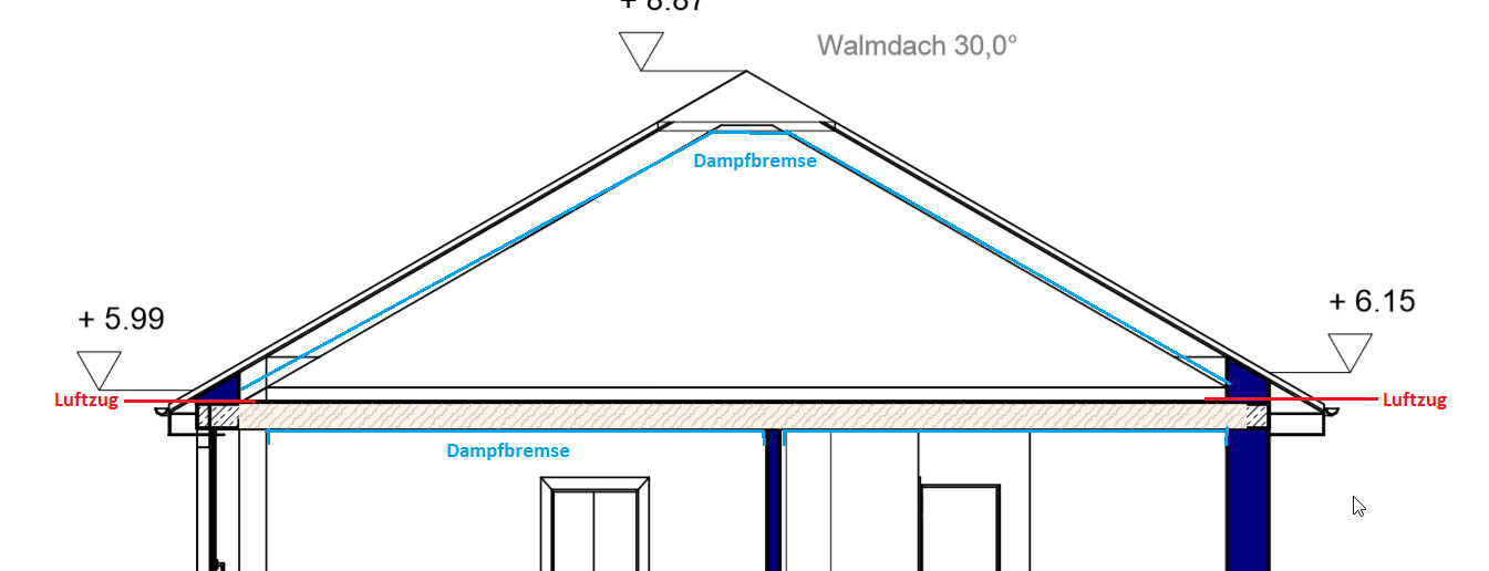 und zwar haben wir heute beim Blower Door Test gemerkt, dass wir die Dampfbremse scheinbar falsch angeschlossen haben. Kurz vorweg: wir haben ein zweigschössiges Haus gebaut mit einem Walmdach und 35° Grad Dachneigung. Wir Die Heizung und Lüftungsanlage steht auf dem Dachboden. Deshalb haben wir jeweils die Holzbalkendecke im Obergeschoss und das Dachgeschoss jeweils mit 24er Dämmung und Isover Dampfsperre versehen.