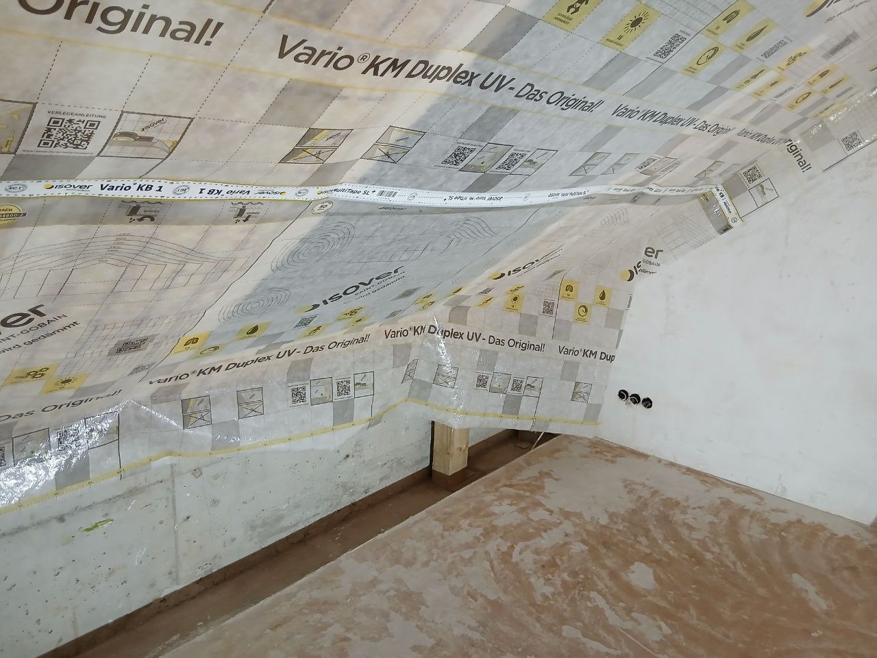 Ich wollte die Folie am Betondrempel anbringen. Das Problem ist rechts der aufgebockte Sparren. Durch diesen wird es extrem kompliziert. Ich hatte geplant die Folie an der Stelle komplett einzuschneiden und diese dann an das Holz zu legen und dort mittels Klebemasse und Klebeband zu befestigen. Das wird voraussichtlich schwierig, weil ich auch wenig Platz habe. Der Streifen an Wand und Holz ist mit Primer angestrichen, das sägeraue Holz habe ich an der Anschlussstelle etwas abgeschliffen.
