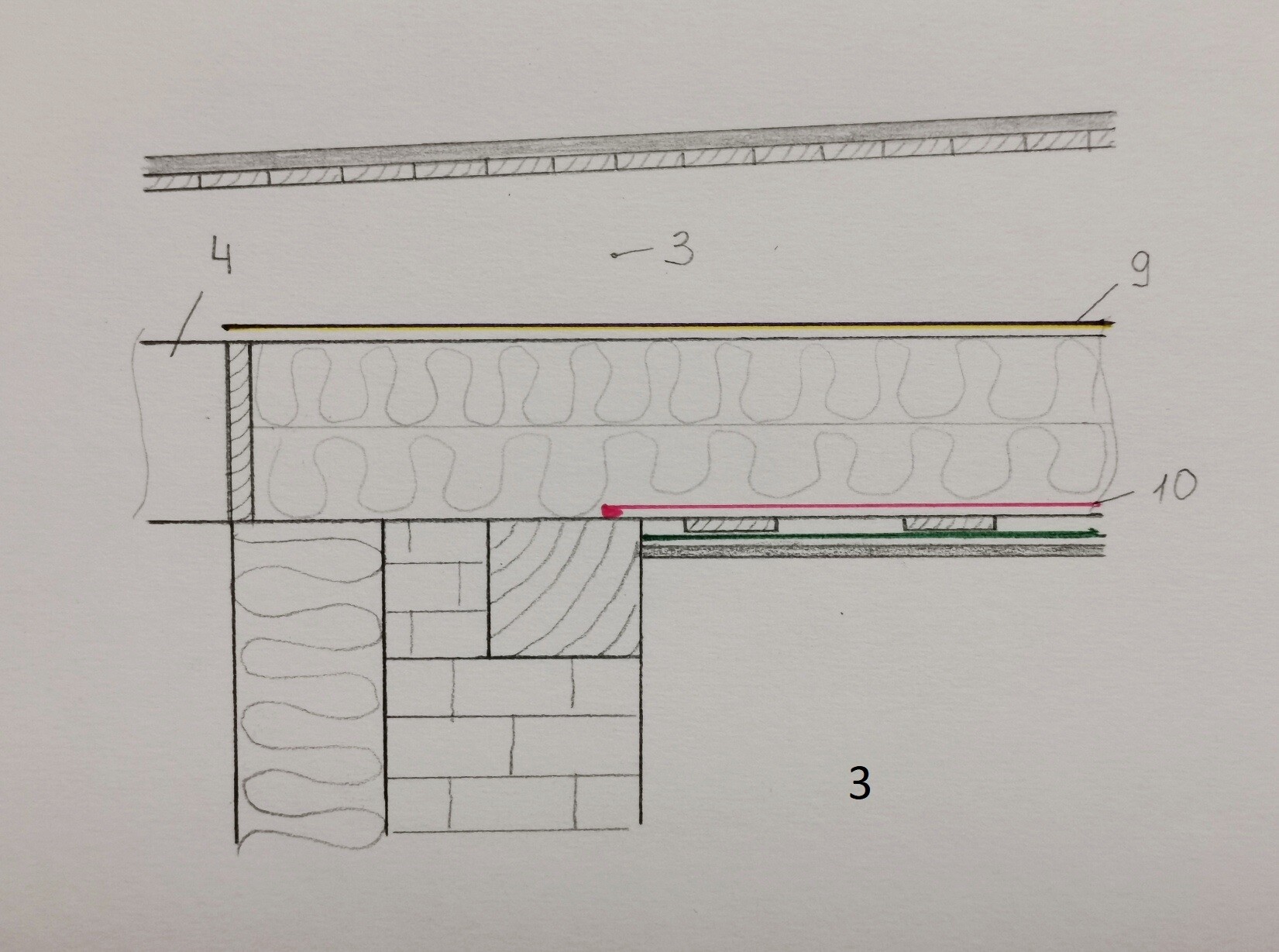 Die letzte Frage betrifft den Bereich, wo die Dampfsperre an den Außenwänden enden sollte. Das ist die Zeichnung Nr.3. Derzeit reicht die Dachdämmung nur bis zur Wand, es wurde aber geplant sie bis zur Außenkante Fassadendämmung zu führen, die Dampfsperre jedoch nur bis zur Pfette.
