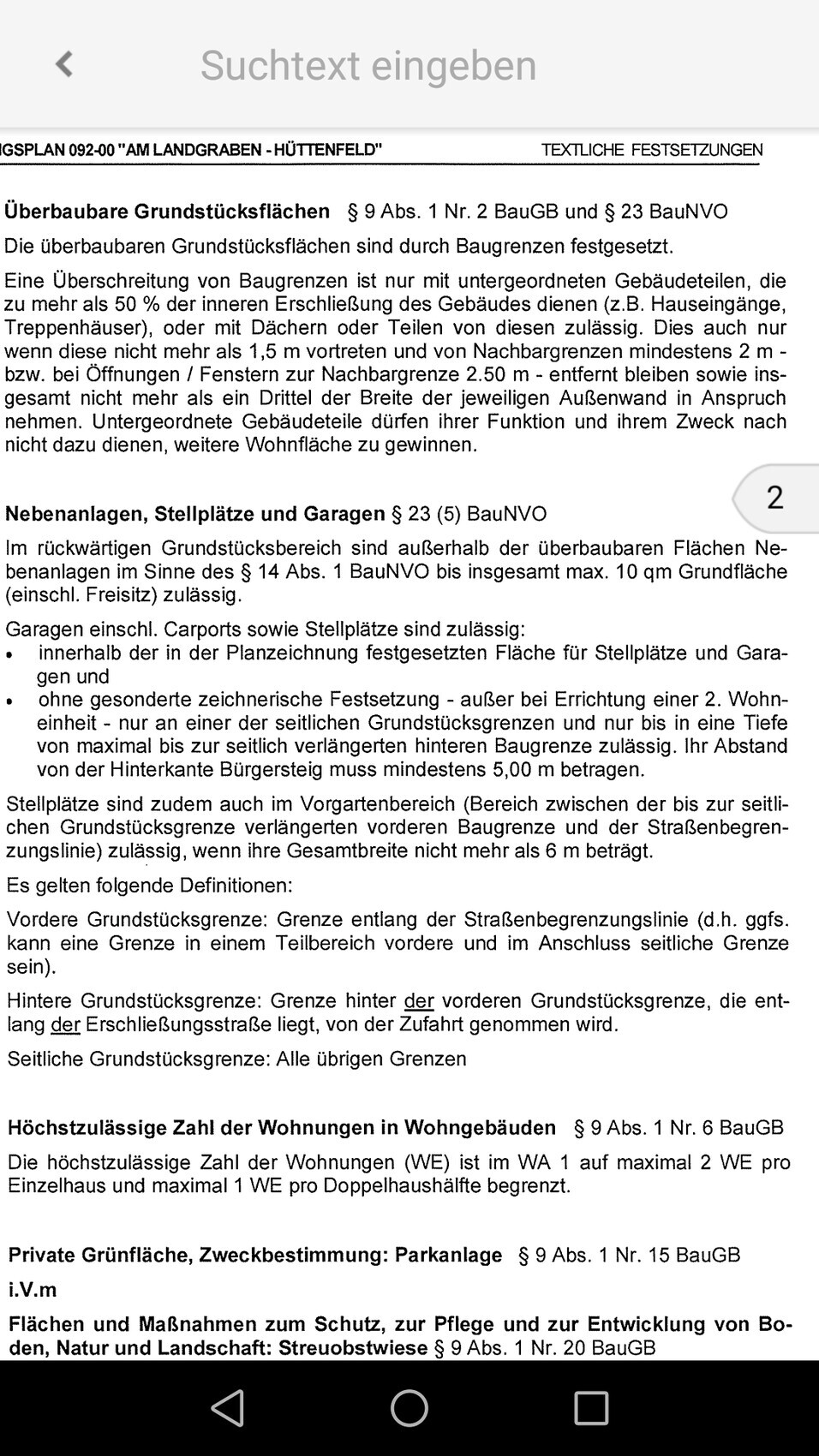 Bildschirmfoto einer Rechtsnorm: Text zu überbaubaren Grundstücksflächen und Stellplätzen im BauGB.