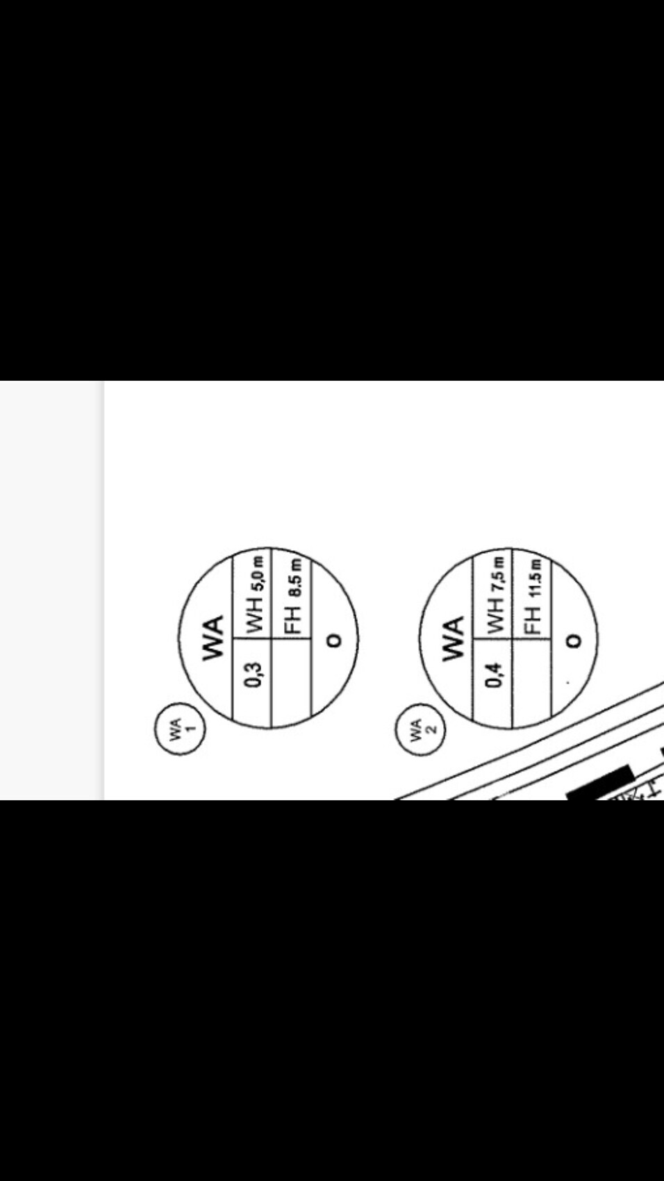 Zwei Kreise mit WA links, O rechts; Maße 0,3/0,4 m; WH/FH 5,0/8,5 m und 7,5/11,5 m; WA1/WA2.