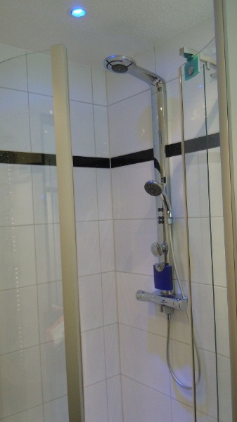 der geschlossenen Viertelkreisdusche ist auch nicht annähernd etwas ausgeblüht etc. Die Decke war mit Raufaser tapeziert und normaler Farbe gestrichen.