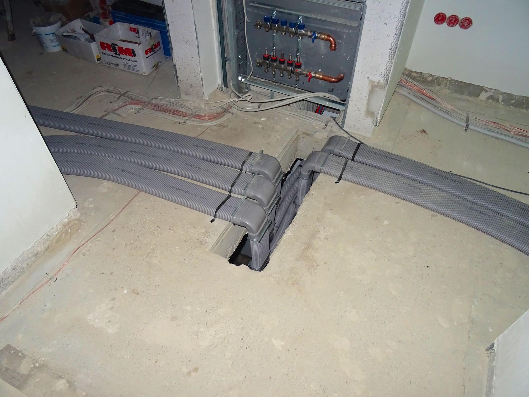 Graue Kabelrohre verlaufen über dem Betonboden; daneben Installationsverteiler mit Kupferrohren.