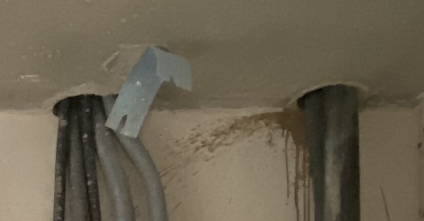 Zwei Rohre an feuchter Wand; braune Wasserflecken unterhalb der Decke, Klebeband sichtbar.