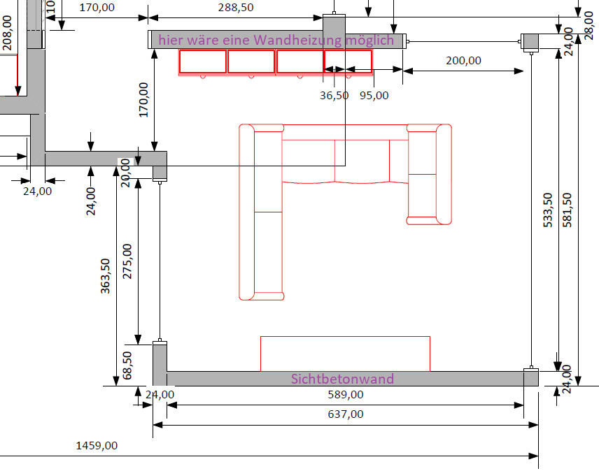 Da die einzig große Wand eine Sichtbetonwand werden soll ist da keine Wandheizung möglich.