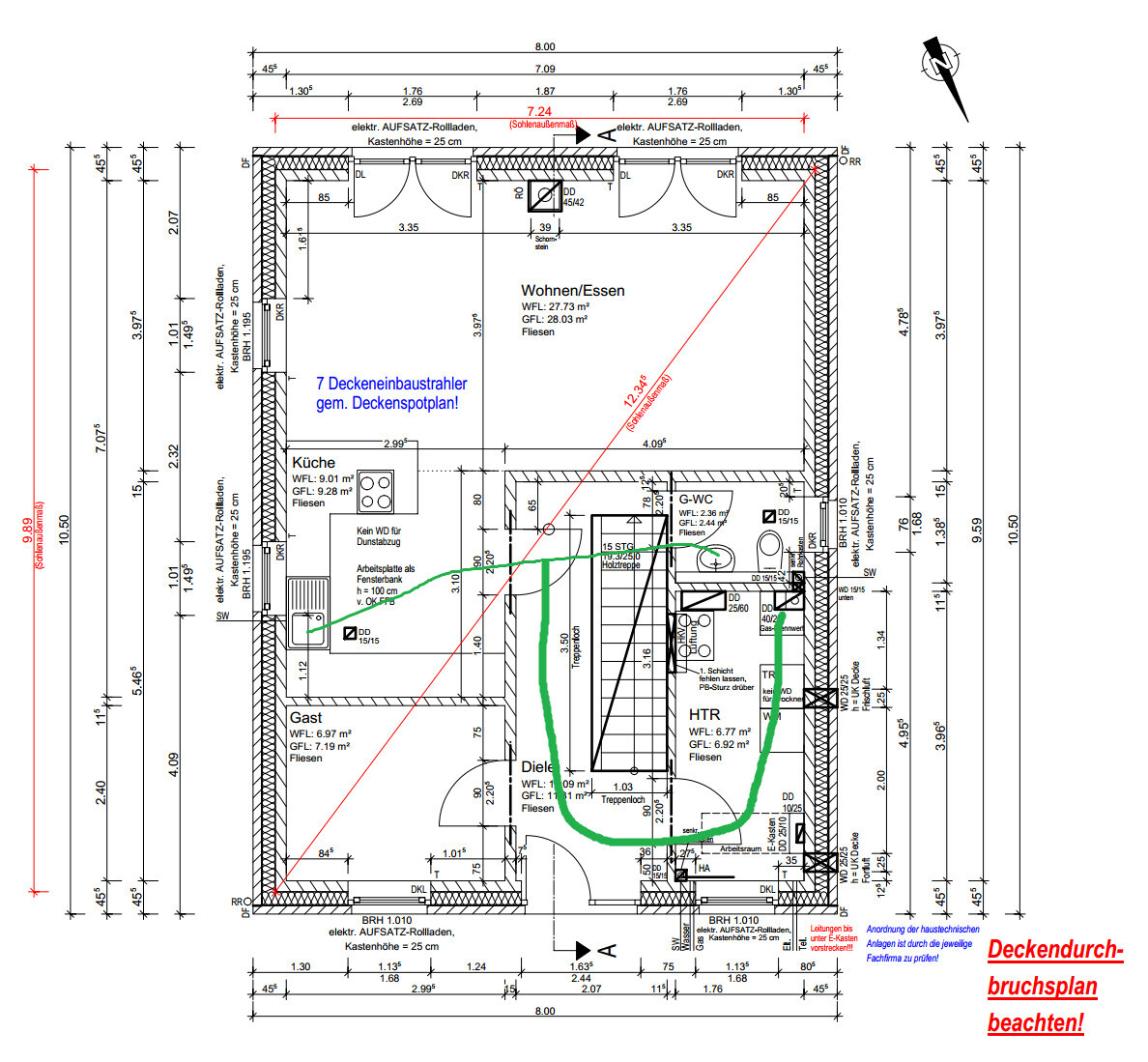 In diesem Fall hätte ich eine Verlegung vom Trinkwasserwärmer auf kürzestem Weg, das wären hier gut 7 m zur Küche u. 2 zum WC verlegt. Ohne Zirkulation.