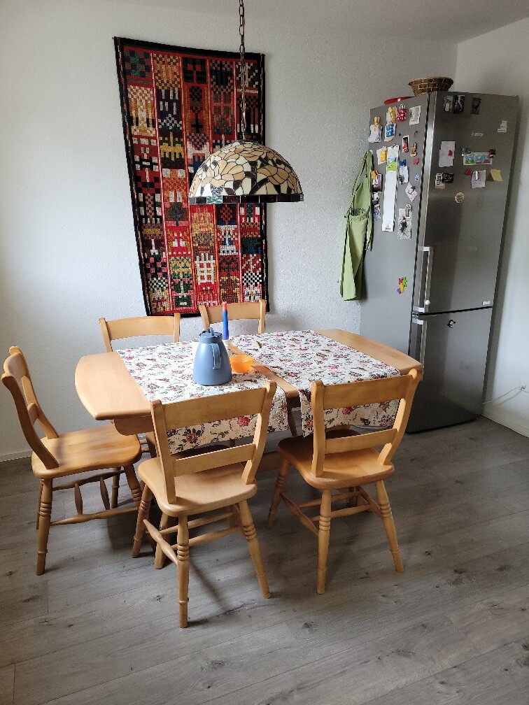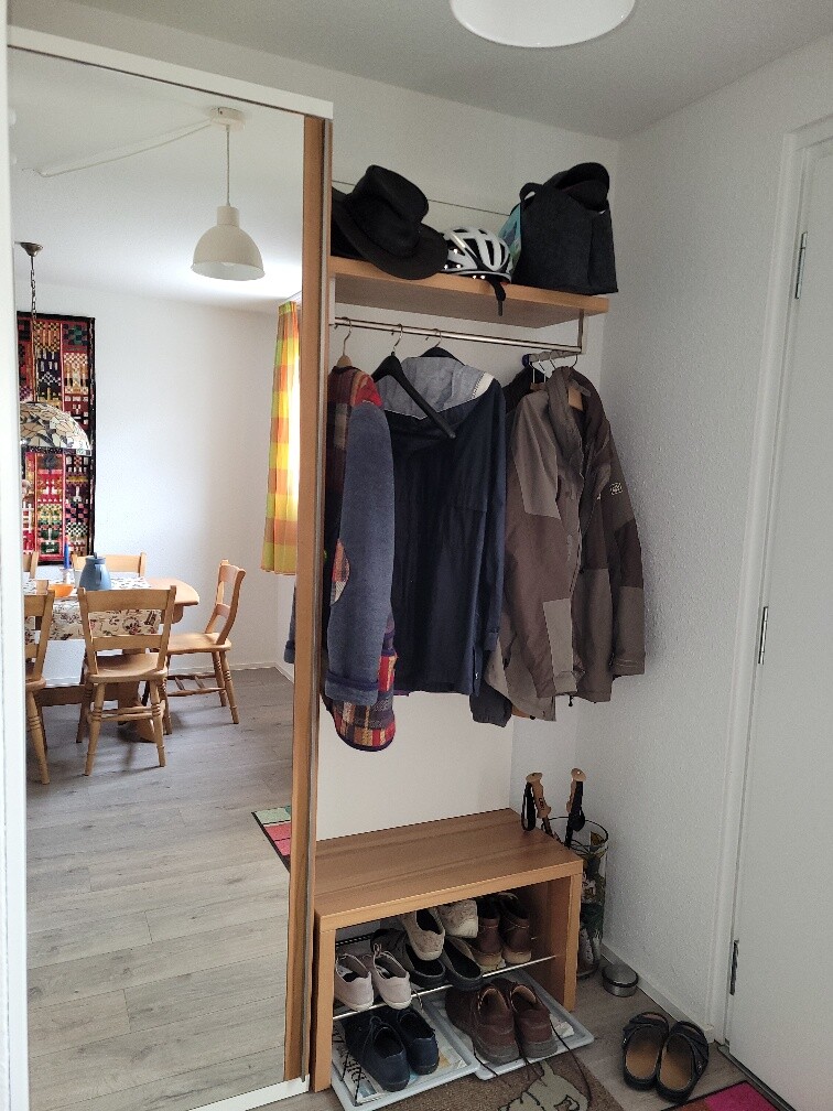 Bilder sagen am meisten aus. Deshalb hänge ich mal zwei an. Wir haben beruflich bedingt einige Zeit in den USA gelebt. Dort öffnet man die Haustür und steht im Wohnzimmer. Daran sind wir also gewöhnt. Und hier ist es nur die Essecke. Passt also.