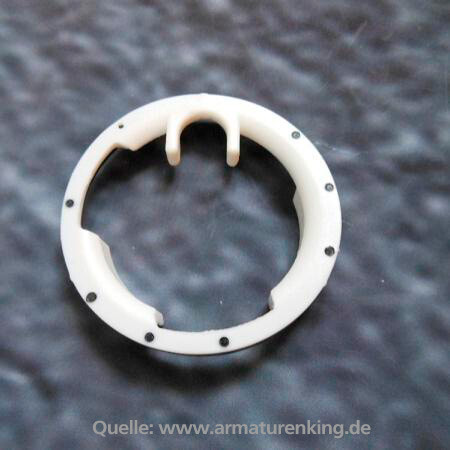 Weißer runder Kunststoffring mit Befestigungsbohrungen, vermutlich Sanitär- oder Haustechnikteil.