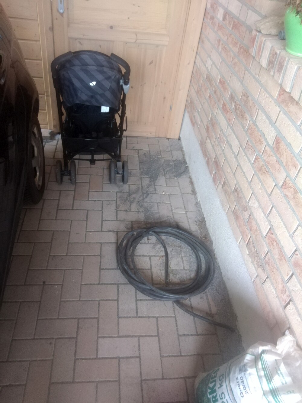 Mein Problem ist nur, dass dieses Kabel neben unserer verklinkerten Hauswand sowie unserem Auto liegt. Zwischen Auto und Hauswand sind jedoch immer nur so maximal 1m Platz vorhanden. Das Kabel stört dementsprechend erheblich den Durchgang, auch zum Abstellraum hinten (Holztür auf dem Foto).