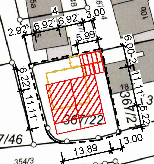 Auch dieser Durchgang vor den 2 (roten) Garagen ist Gemeinschaftseigentum. Wenn ich die alte Garage so belasse, wie sie ist, müsste ich seinen Anteil an diesen zusätzlichen 9 m² von ihm kaufen.