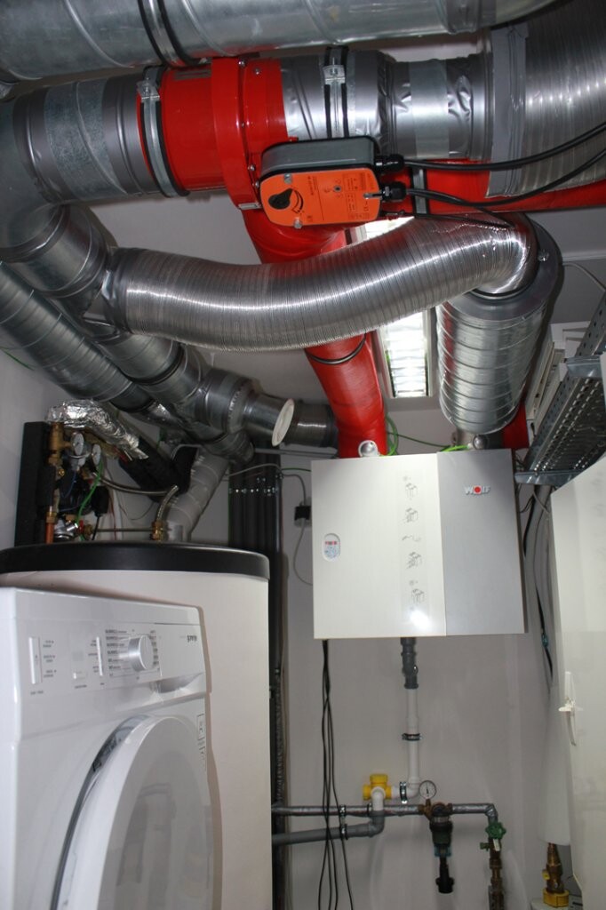 Technikraum mit rotem Rohr, vielen Metallrohren, Boiler und Waschmaschine.