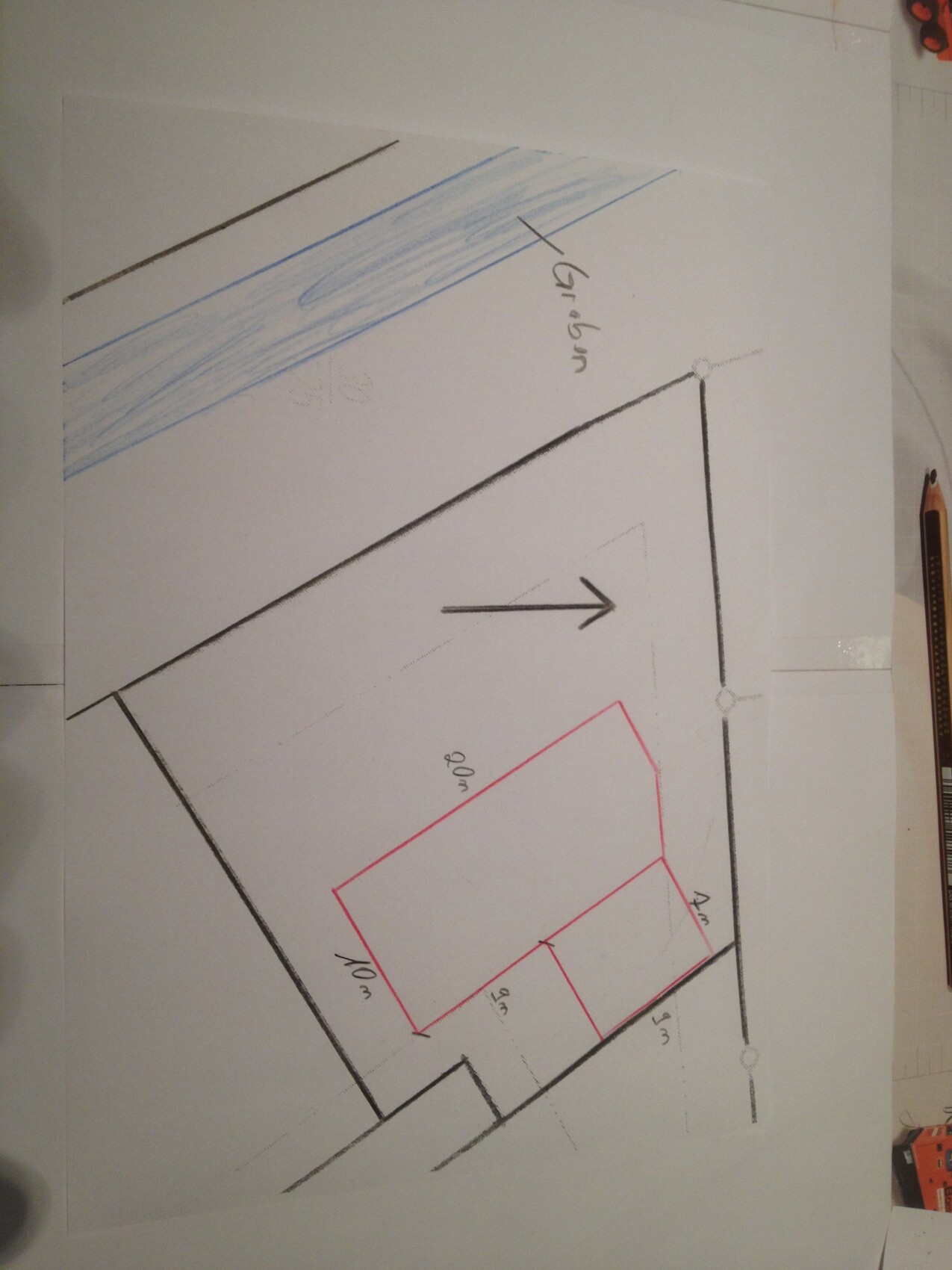 In einer vorherigen Skizze hatte ich die Küche auf der Süd West Seite,das aber zu Gunsten des Büro / Gästezimmers wieder verworfen. Kürzer war der Weg durchs Wohnzimmer da auch nicht.
