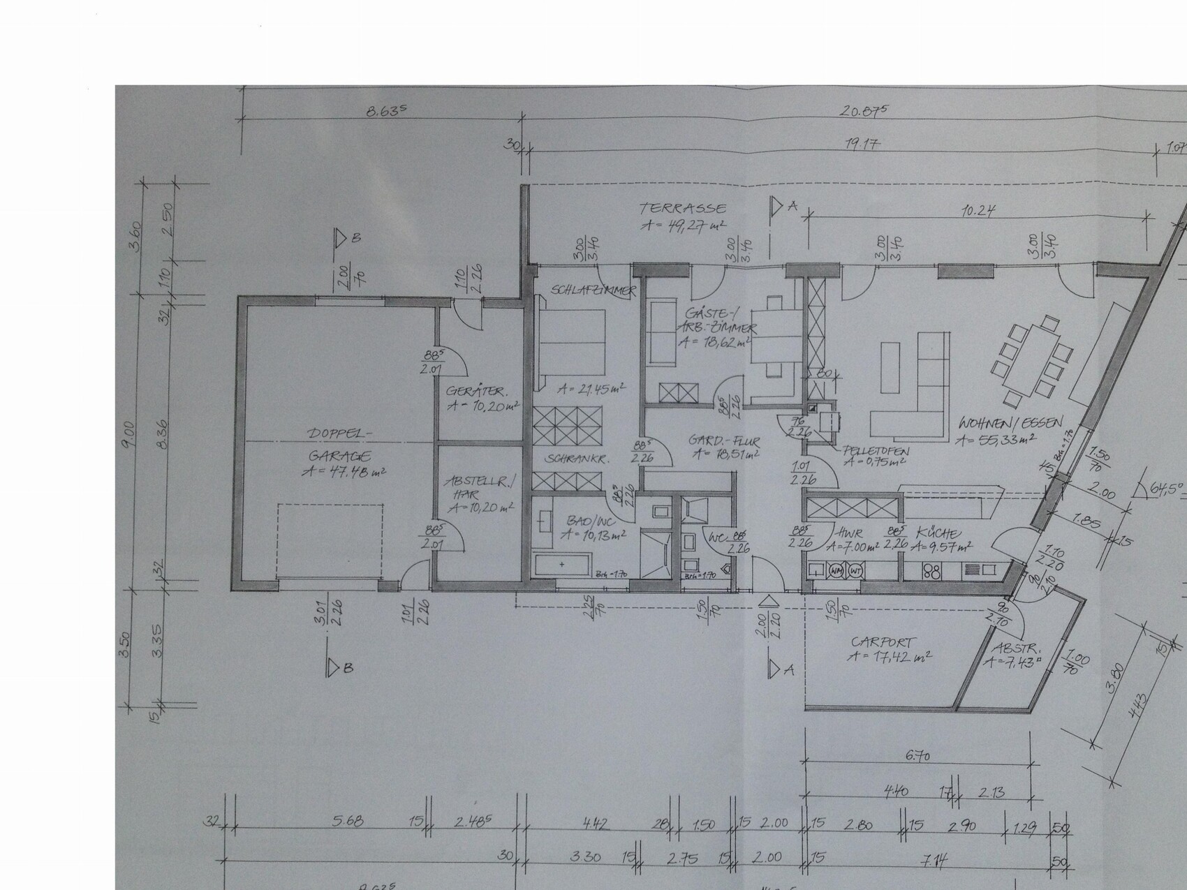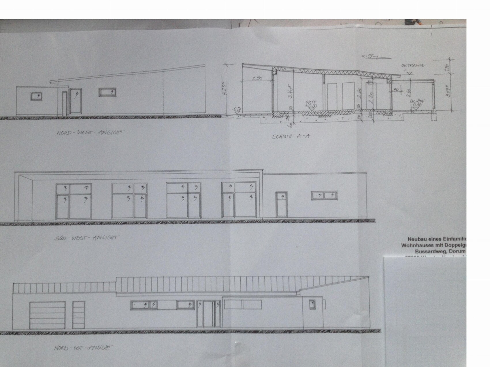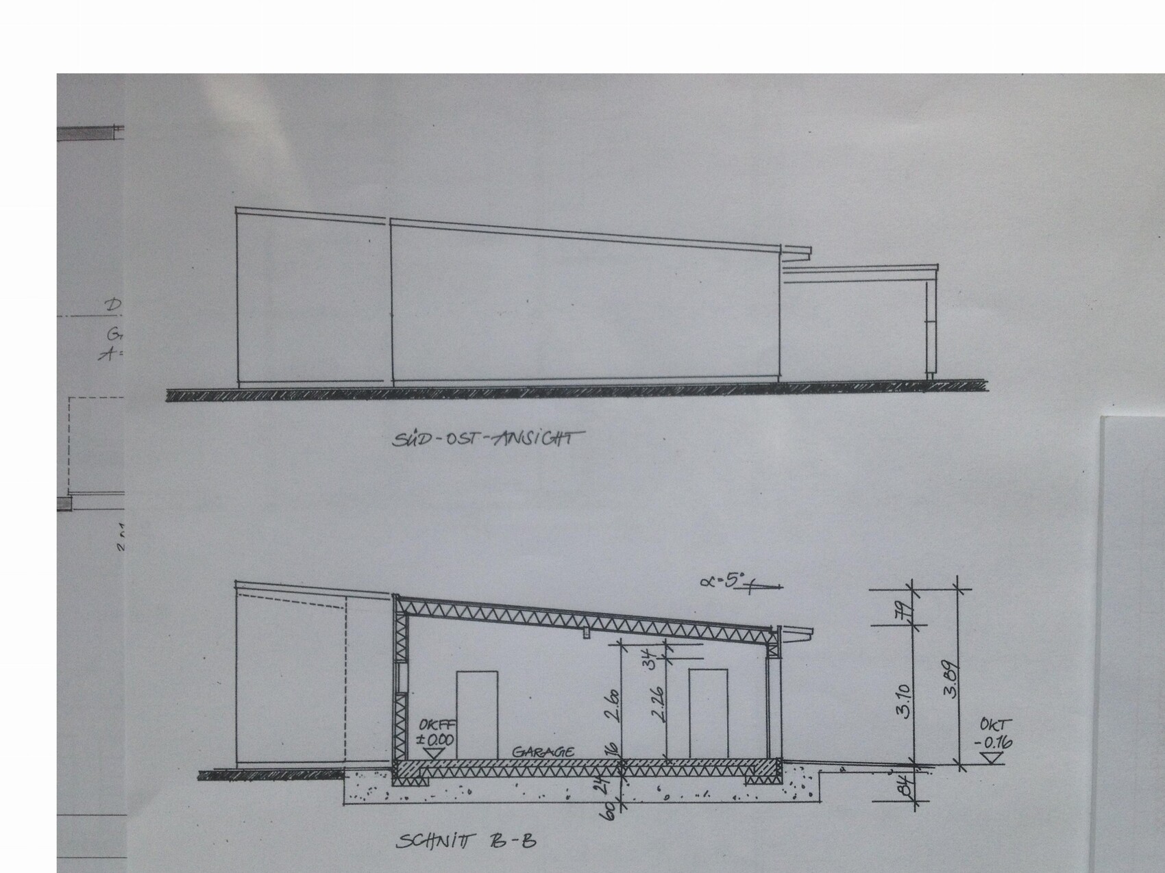Vom Vorentwurf zum Stand zur Bauanzeige hat sich dann im Garagenbereich noch etwas geändert. Die Garage ist nun auf 9 m geschrumpft aber bis auf die Grundstücksgrenze gewachsen.